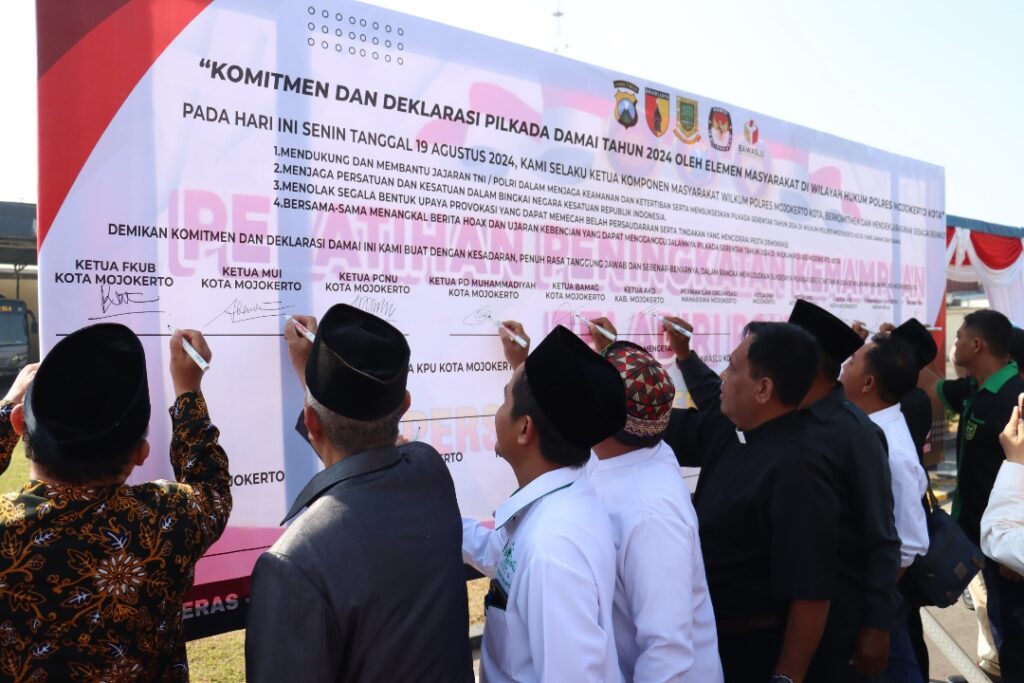 Dihadiri, Pj Walikota Mojokerto Moh. Ali Kuncoro, Kapolres Mojokerto Kota AKBP Daniel S. Marunduri S.I.K., M.H., Kajari Kota Mojokerto Bobby Ruswin, Ketua MUI Kota Mojokerto KH Abdul Halim Hasyim M.Pd.i., seluruh perwakilan elemen masyarakat satu suara mendeklarasikan siap mendukung Pilkada Damai 2024 di Wilayah Hukum Kota Mojokerto. Deklarasi ini diikuti oleh Toga, IPSI, PWI, Organisasi Mahasiswa, Organisasi Suporter Sepak Bola, hingga Eks Napiter.