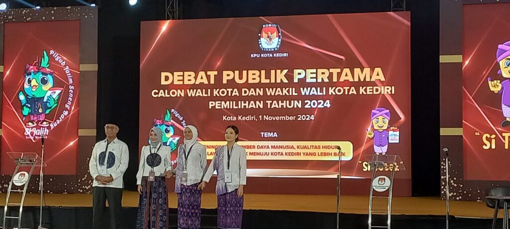 Debat pertama berlangsung di Insumo Kediri Convention Center (IKCC) Jalan Urip Sumoharjo Kota Kediri, Jumat (1/11/2024) pukul 19.30 WIB Debat Pertama ini mengusung tema ‘Sumber Daya Manusia, Kualitas Hidup, dan Layanan Publik Menuju Kota Kediri Yang Lebih Baik,’ dan sejumlah sub tema di antaranya Layanan Dasar dan Pengentasan Kemiskinan.