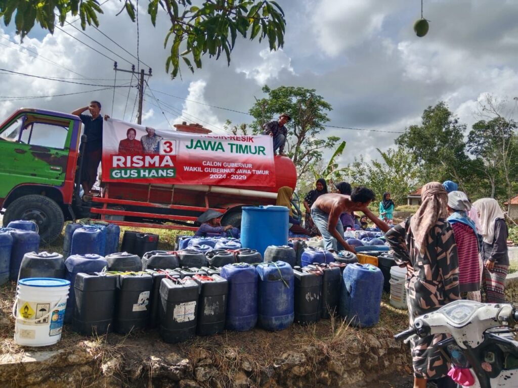 Distribusi air bersih kepada warga oleh truk tangki ber-spanduk kampanye Calon Gubernur Jawa Timur, Risma dan Gus Hans